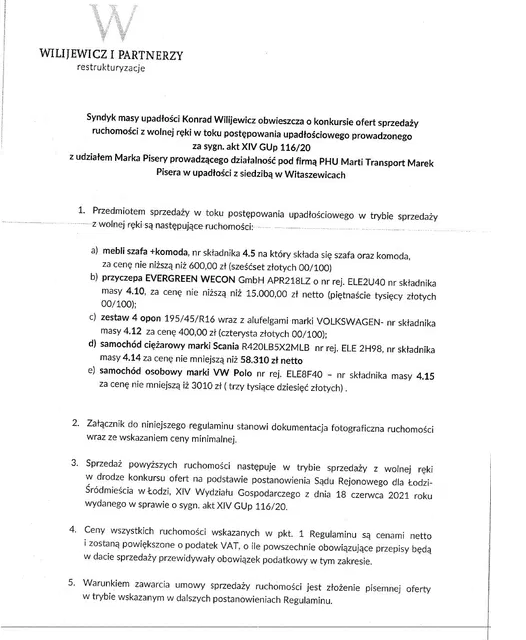 Syndyk Masy Upadłości Konrad Maciej Wilijewicz ( nr lic. 1379) w postępowaniu prowadzonym przed Sądem Rejonowym dla Łodzi Śródmieścia w Łodzi XIV Wydziałem Gospodarczym dla spraw Upadłościowych i Restrukturyzacyjnych sygn., akt : XIV GUp 116/20 obwieszcza o konkursie ofert sprzedaży w toku postępowania upadłościowego w trybie sprzedaży z wolnej ręki następujących ruchomości: