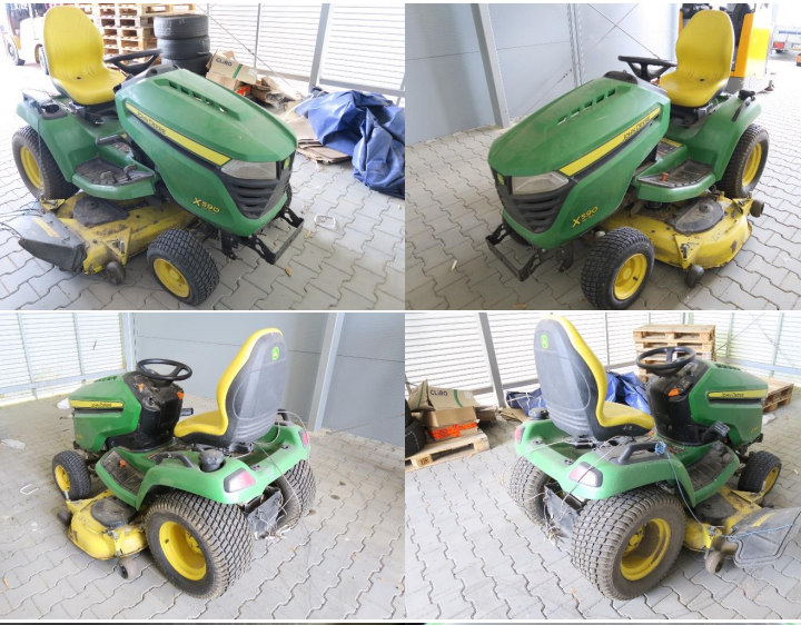 f)      Kosiarka samojezdna JOHN DEERE X590, rok produkcji 2015, przebieg: 210 mth, cena wywoławcza 7 930,00 zł netto (9 753,90 zł brutto),
