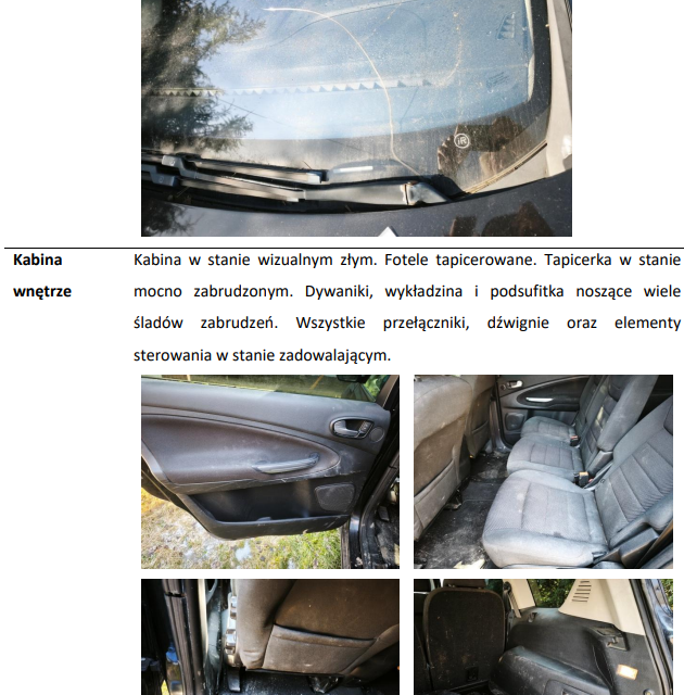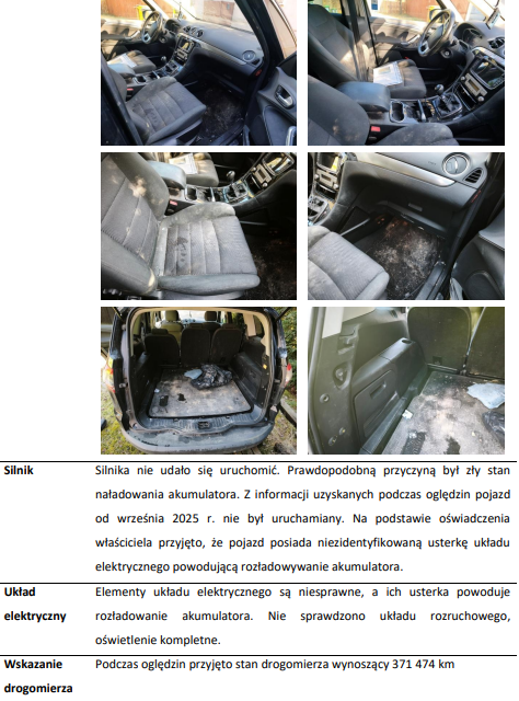 Syndyk masy upadłości oferuje do sprzedaży z wolnej ręki składnik masy upadłości w postaci: Samochodu osobowego marki Ford S-Max rok produkcji: 2010 nr rejestracyjny: GD 9556V nr VIN: WF0SXXGBWSAT85925 przebieg: ok. 371 474 km silnik: 2.0 TDCi (103 kW), diesel Stan techniczny pojazdu: Pojazd jest uszkodzony i niesprawny technicznie. Najważniejsze informacje: brak możliwości uruchomienia silnika (prawdopodobnie rozładowany akumulator oraz usterki układu elektrycznego) podejrzenie problemów z instalacją elektryczną i sterowaniem turbosprężarki przednia szyba pęknięta uszkodzenia elementów nadwozia (m.in. listwa tylnej klapy, klamka drzwi) ślady wcześniejszych napraw blacharsko-lakierniczych stan ogumienia zły wnętrze pojazdu w stanie zużytym i zabrudzonym Pojazd od dłuższego czasu nie był użytkowany. Cena sprzedaży: 8 900, 00 zł (słownie: osiem tysięcy dziewięćset złotych 00/100). Samochód jest w stanie technicznym i prawnym istniejącym w dniu sprzedaży. Przedmiot sprzedaży można oglądać, po uzgodnieniu terminu wizyty pod numerem telefonu 79*******28 od poniedziałku do piątki w godzinach od 9:00 do 15:00. Operat szacunkowy dostępny jest w Kancelarii syndyka w Gdańsku przy ul. Obrońców Westerplatte 24/9 w dni powszednie w godzinach od 9:00 do 15:00.